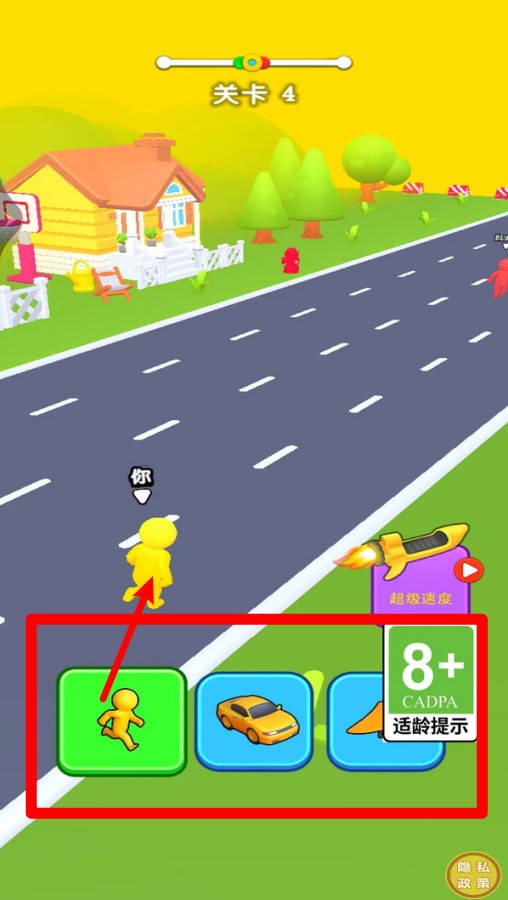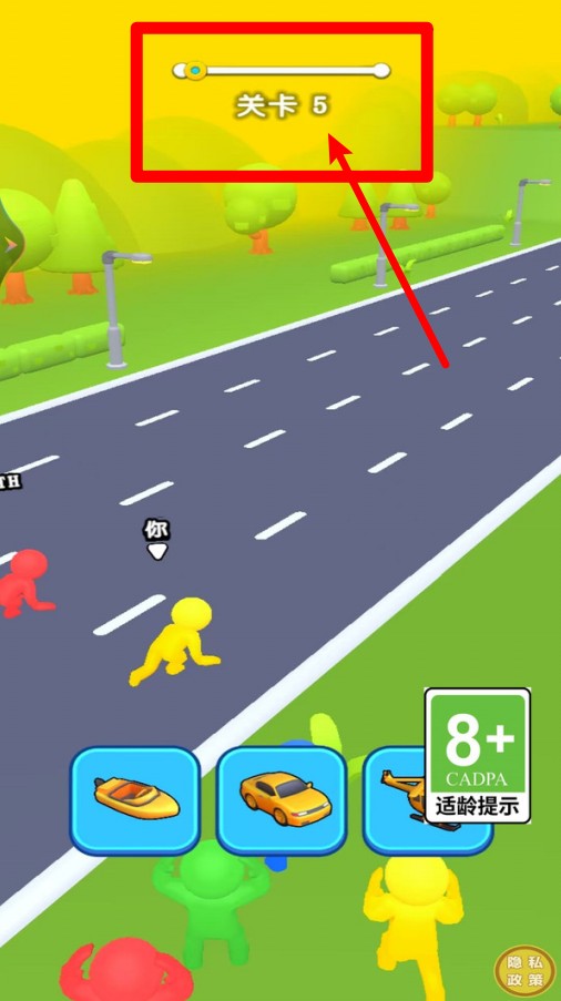 3.画面上方会显示当前关卡编号与进度条,方便玩家掌握冲刺进度和距离终点还有多远。