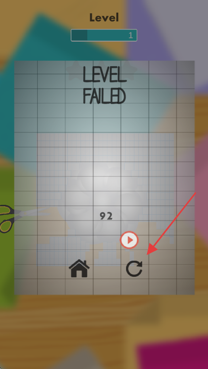 3、若显示【LEVELFAILED】,点击下方刷新图标重新挑战关卡,调整剪纸操作,争取过关;也可点击房子图标返回主界面。