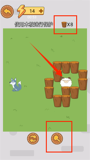 2、通过点击屏幕合适位置放置木桩来搭建围栏,将羊群围在安全区域内;点击界面中的木槌图标还能加固木桩,使其更坚固,防止被破坏。