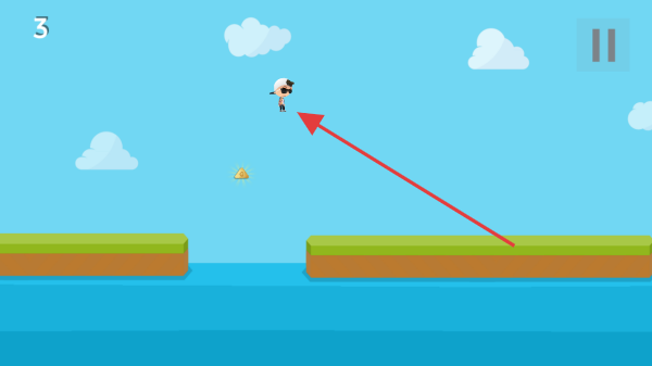 2、操控角色在空中跳跃,注意收集金色道具(如星星),跨越绿色草地与蓝色水域组成的障碍,保持前进。