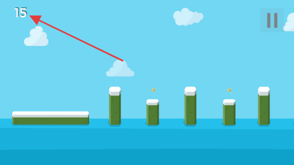 3、继续跳跃,面对新出现的绿色柱子障碍,调整角色跳跃时机与方向,顺利越过,推进关卡进度。