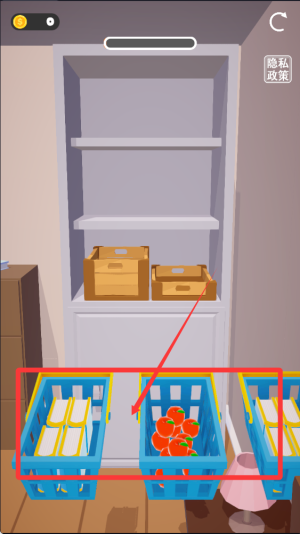 1、玩家需要将散乱的食品、饮料等物品按照类别和大小分类,有序地放入冰箱不同区域,完成整洁的收纳布局。