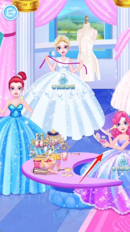 1、在沙龙场景,点击箭头指向的公主,进入专属美容、装扮流程,开启个性化打造。