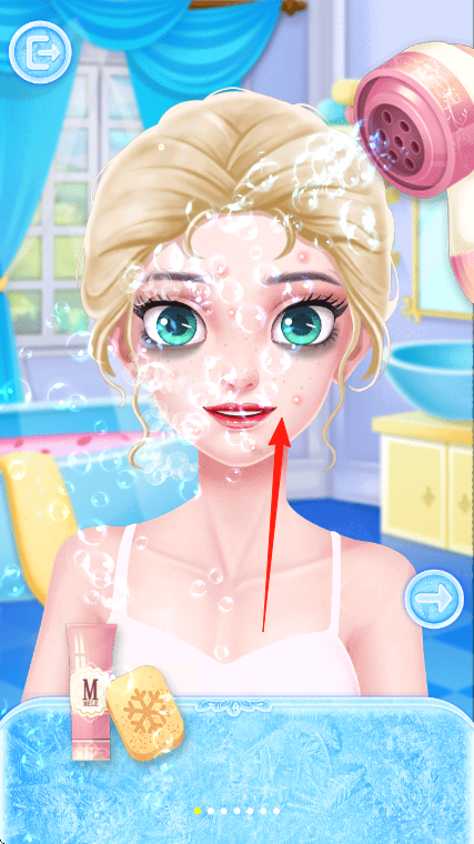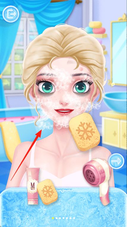 2、进入美容界面,用雪花海绵等工具,按箭头指引清洁面部,完成基础护理步骤。