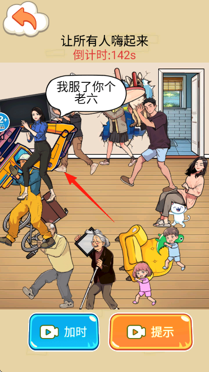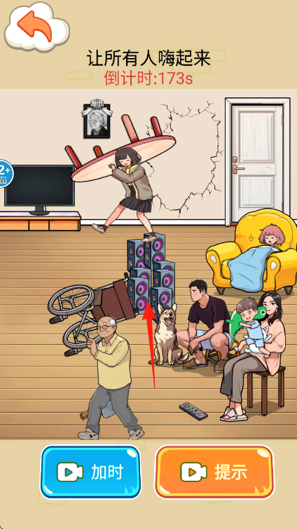 2、进入“让所有人嗨起来”场景,观察箭头指向的音响,点击互动,触发角色反应,完成任务。