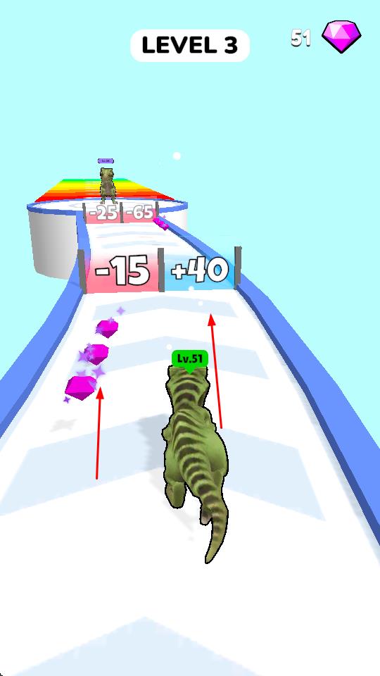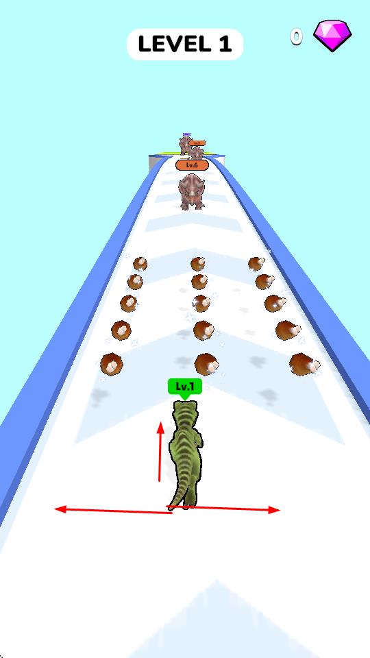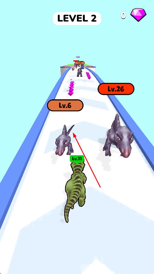 2、“吞噬进化”,吞噬跑道上的食物、低等级恐龙(如Lv.6、Lv.26),提升自身等级(Lv.1→Lv.11→Lv.51)。
