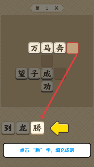 1、在成语关卡,点击“腾”字,填入空格,完成“万马奔腾”成语,通过第1关,解锁新答题内容。