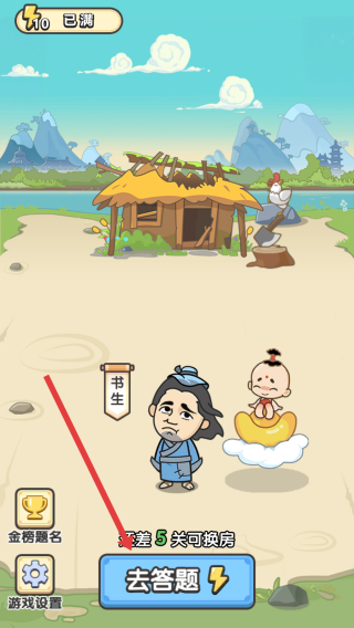 3、点击“去答题”按钮,进入新答题挑战,完成题目,推进关卡,达成“差5关可换房”目标,升级场景。