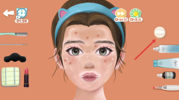 2、操作流程:依步骤,用工具清理痘痘、瑕疵,选化妆品上妆,限时(如1:59)内完成。