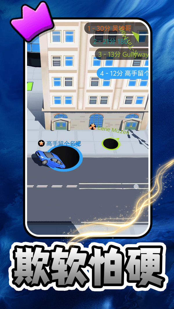 2.玩家等级比拼:画面右上角实时显示等级排行,灵活走位持续吞噬周围物体来快速压制其他对手玩家。
