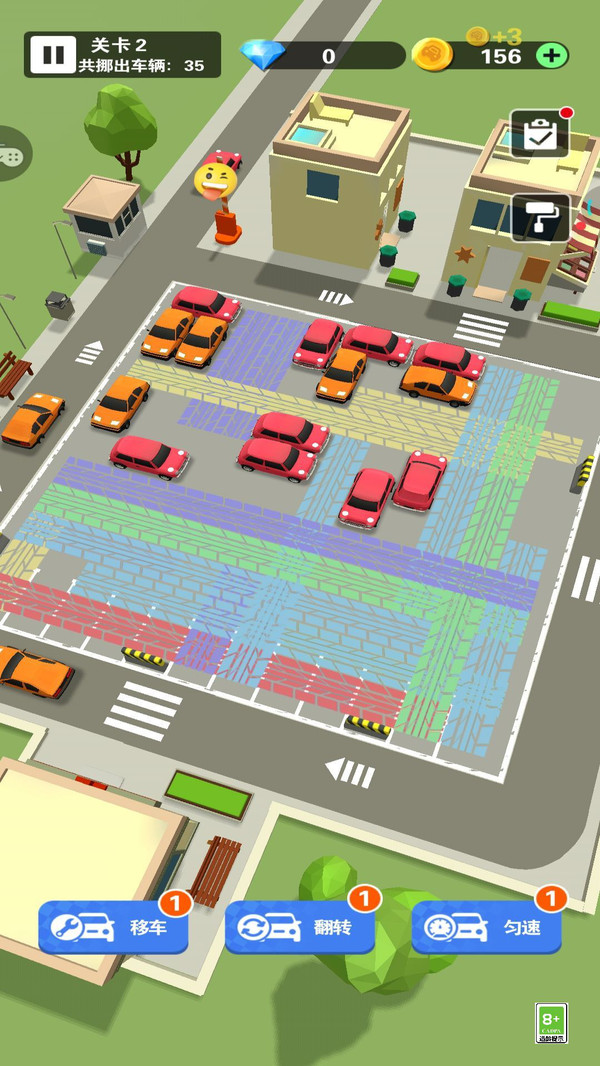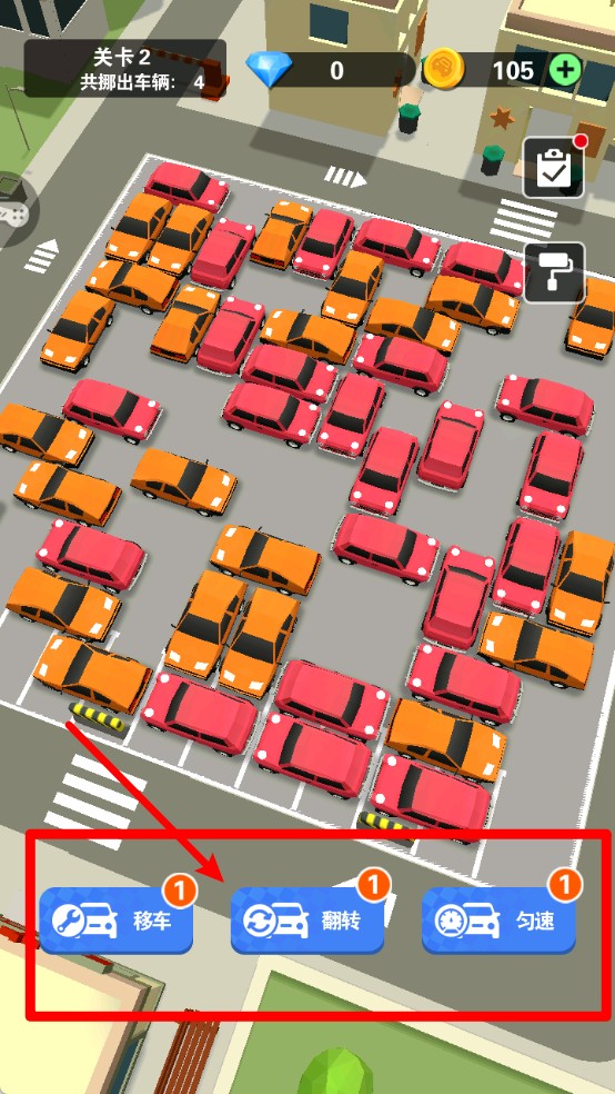 2.道具功能辅助:游戏内可使用“移车”、“翻转”、“勾速”等技能按钮,帮助你顺利挪车、调整方向,化解困局顺利过关。