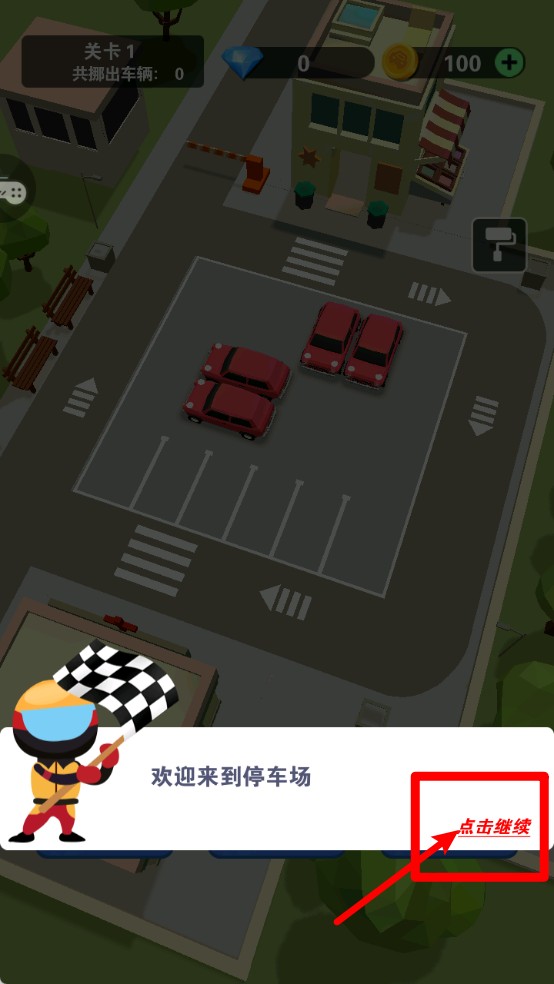 1.点击继续开始:新手引导页面中点击“点击继续”按钮,即可正式进入停车场关卡挑战,准备开启烧脑移动之旅。