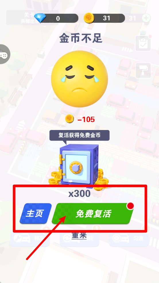 3.金币不足提示:金币消耗超过当前余额时会出现提示,此时可选择“免费复活”获得额外金币,继续游戏不卡关。