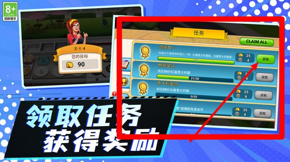 3.任务列表中可查看当前挑战进度,风味早餐店达成指定目标后可点击“获取”按钮获取金币与奖励资源,任务可单领也可一键领取全部。