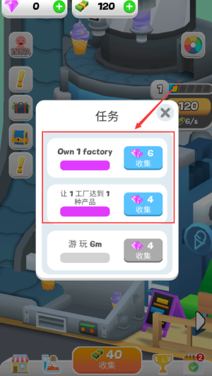4、点击收集按钮,完成拥有1工厂任务领取6钻石。