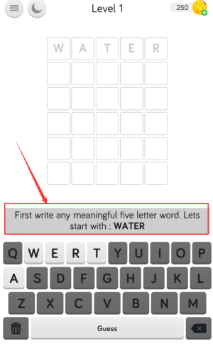 2、按照红色框内提示,先输入water五字母单词。