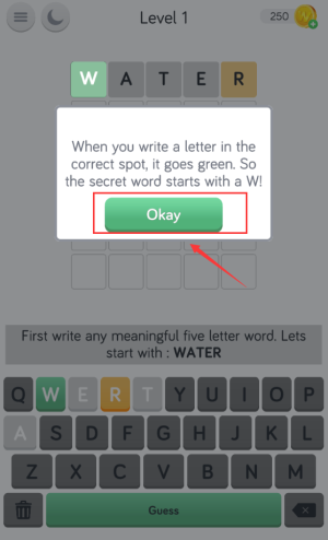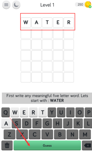3、点击绿色guess按钮,提交water单词答案。