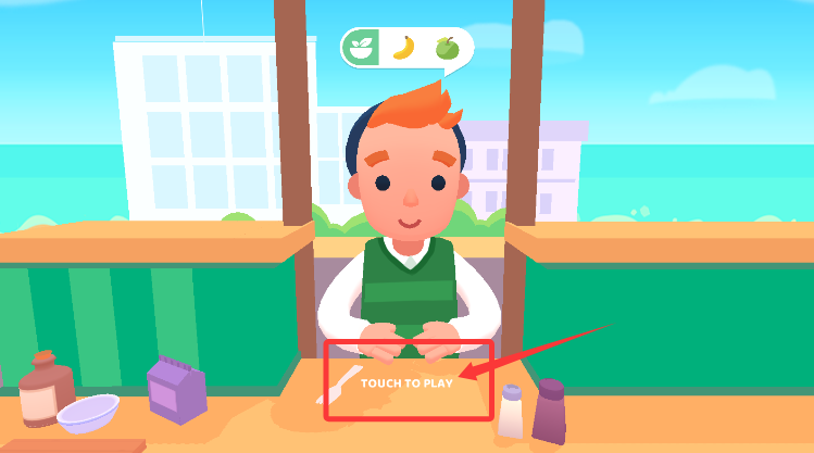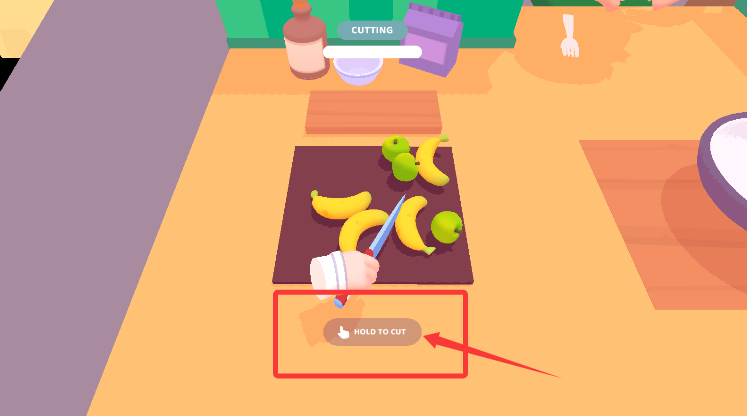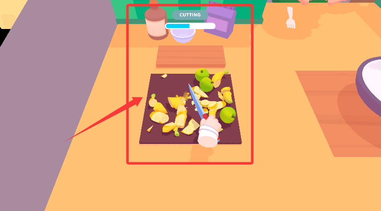 2、进入食材处理界面,按住切割区域完成水果蔬菜的加工准备。
