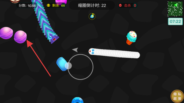 2、进入大逃杀游戏场景后,操控角色收集场景中的紫色球体等资源,提升自身分数和能力,同时留意【缩圈倒计时】,避免处于危险区域。