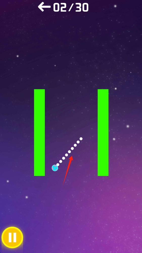 2、游戏关卡(02/30 ),蓝色小球需弹射穿过绿色障碍,轨迹用白点显示,按住瞄准。