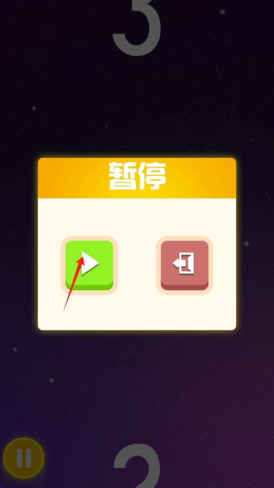 3、暂停界面,有 “继续”(绿色播放 )、“返回”(粉色回退 )按钮,用于控制游戏进程,点击继续。