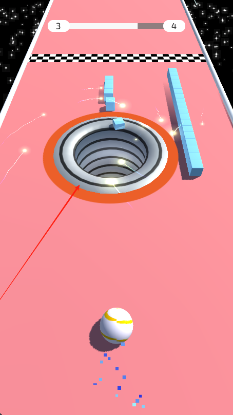 2、通过滑动屏幕控制黑洞吞噬或避开沿途各种障碍物,找准角度让小球朝着终点前行,当黑洞周围的进度条满的时候,黑洞会变得更大。