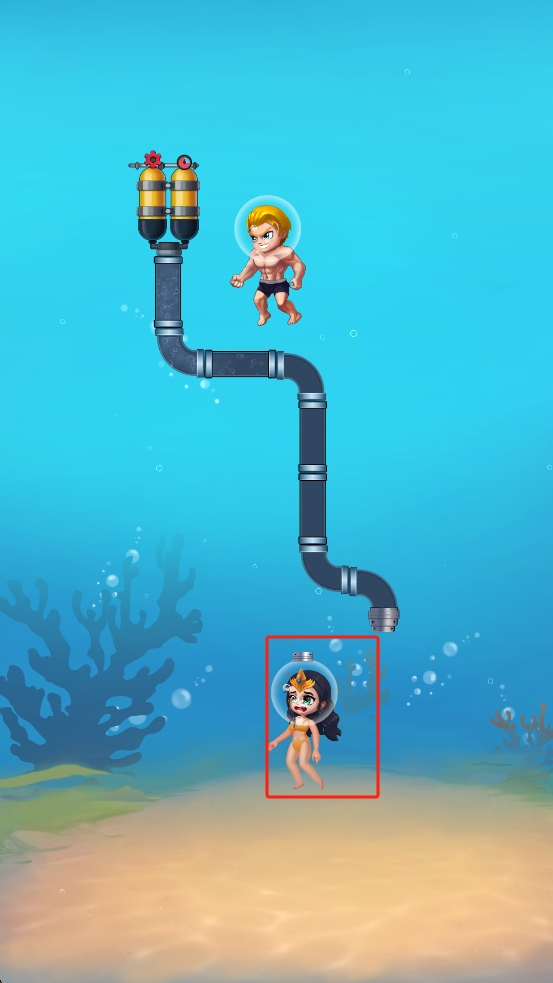 2、观察管道连接与人物位置,点击管道特定部位切割,让上方人物通过管道下降,规划切割顺序,确保下方人物被成功救援。