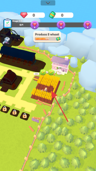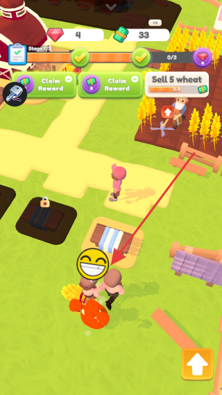 3、解锁谷仓后,按新任务提示“Sell5wheat”,点击箭头指向的相关区域出售小麦,完成任务并获取奖励,发展农场经济。