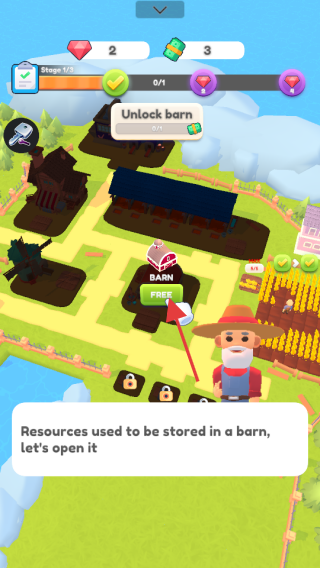 2、完成小麦生产任务后,依据提示“Unlock barn”,点击【barn】进行解锁,用于储存资源,推进农场建设。