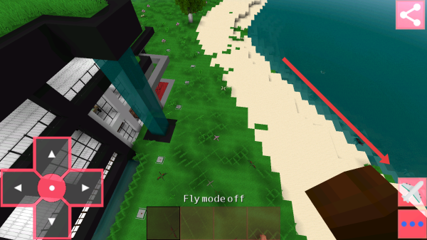 2、在场景中,点击右侧飞机图标,取消飞行模式(Fly-mode-off),切换为地面移动,操控角色,探索海滨现代建筑。