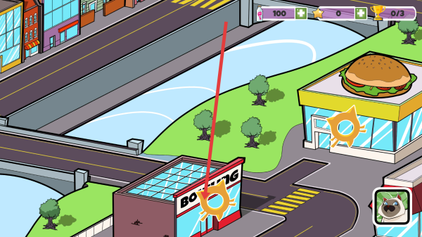 2、在小镇的场景中,跟随箭头点击建筑如BOWLING,触发猫咪收集或任务,获取奖励。