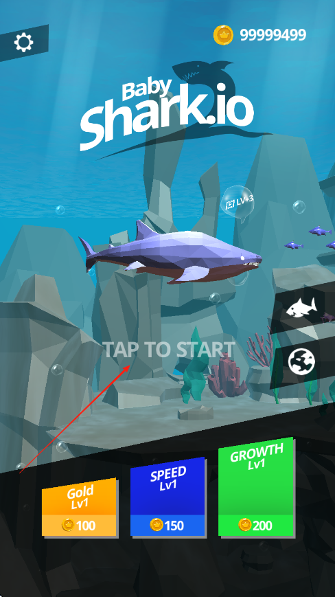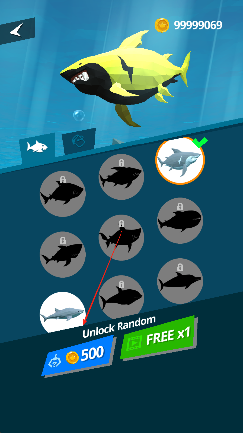 3、从小鲨鱼成长成大鲨鱼,获得第一名,得到的奖励十分丰厚,可以购买鲨鱼的皮肤,500金币随机抽选,可以选择鲨鱼的颜色。