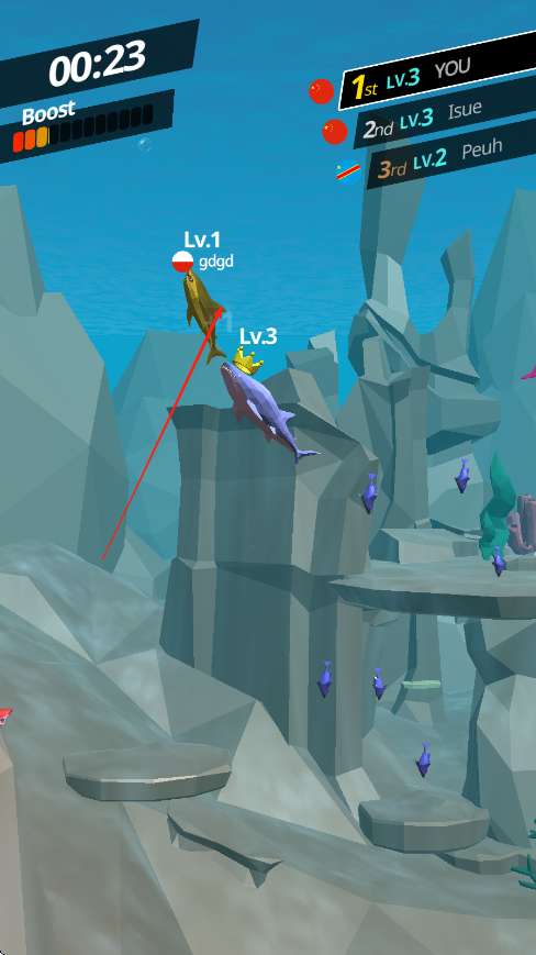 2、捕食小鱼和潜水的人类获得成长,变得越大能吃的鱼更多,可以吃掉比自己小的敌人,吃的越多速度也会越快
