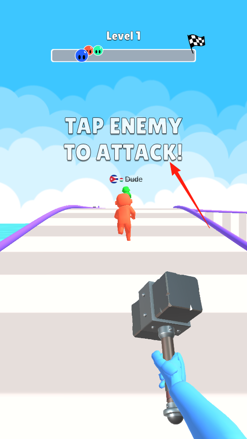 1、打开锤子比赛,进入第一关,玩家拿着大锤子在赛道,上方提示TAP ENEMY TO ATTACK,看到前面橙色敌人,点击它就能用锤子攻击,把敌人击退。