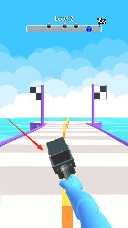 2、到第二关,赛道上是黄色障碍物,拿着锤子冲刺,遇到障碍就用锤子砸,把它们破坏掉,让自己顺利通过,一路砸过去冲向关卡终点,体验用锤子清障畅跑赛道的乐趣。