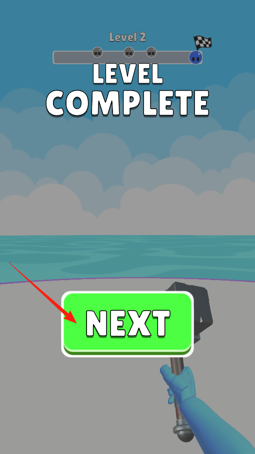 3、第二关通关后,出现LEVEL COMPLETE,点击NEXT进入下一关,继续用锤子攻击破坏,不断解锁新关卡,感受一关接一关的跑酷战斗,挑战越来越复杂的赛道。
