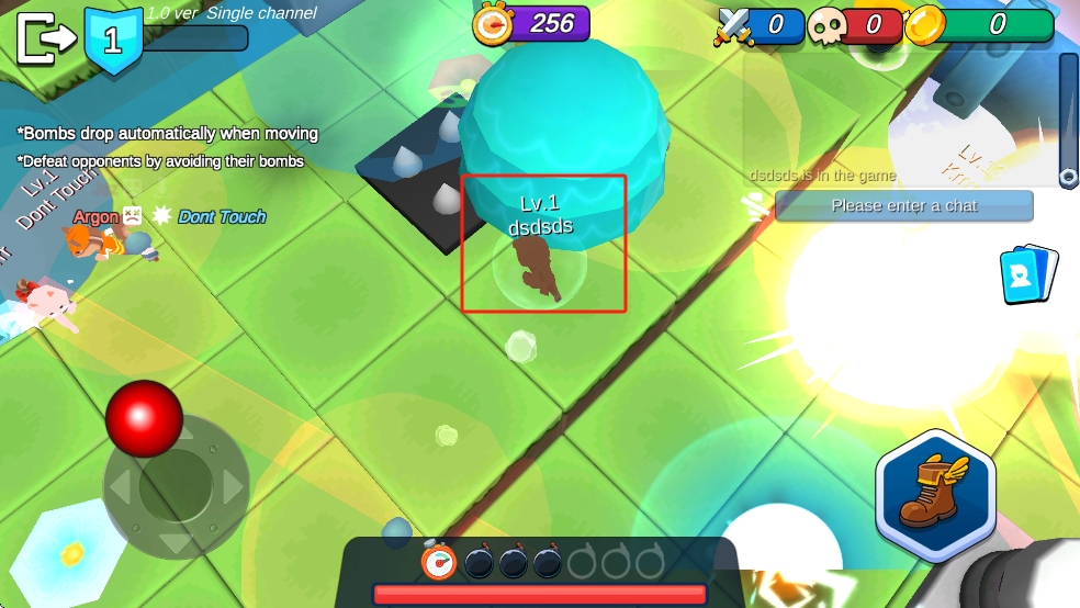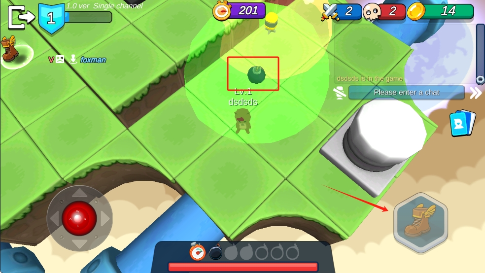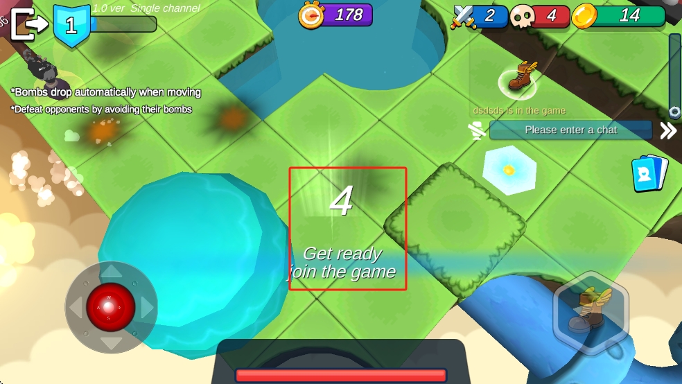 1、游戏的操作还是很简单的,利用左侧摇杆灵活移动,因移动自动投弹,需预判路径,避开对手炸弹同时用自身炸弹攻击。
