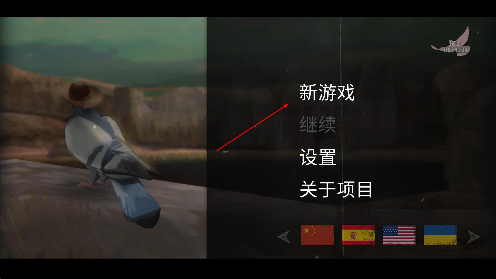 1、进入游戏后选择中文版,点击新游戏开启旅程,通过点击屏幕与鸽子进行对话,在西部世界的初始场景中迈出冒险的第一步,左上角可随时存档。