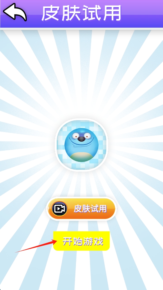 1、皮肤试用”界面,展示蓝色角色皮肤,有皮肤试用看视频 ,和页面展示,点击开始游戏。
