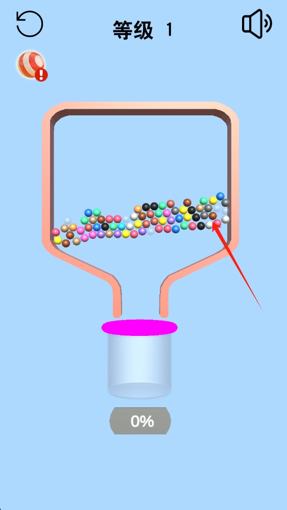 2、等级1关卡,需让彩色小球通过管道落入容器,界面含重玩、点击下落小球。