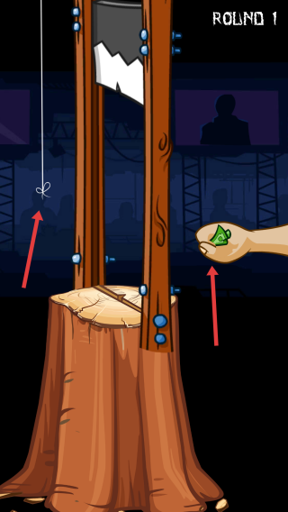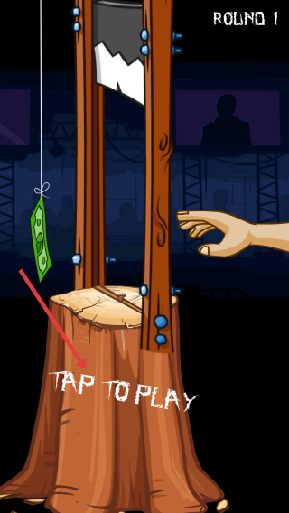 1、ROUND1阶段,点击TAP TO PLAY启动游戏,观察手旁绿色物品与悬挂的钱,把握时机让上方斧头砍断绳子。