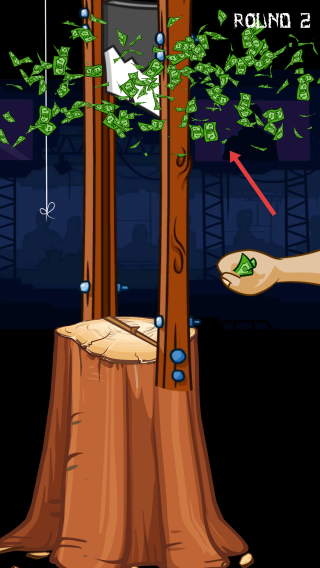 2、斧头落下砍断绳索后,悬挂的钱掉落,收集散落的钞票,完成ROUND1挑战进入ROUND2。