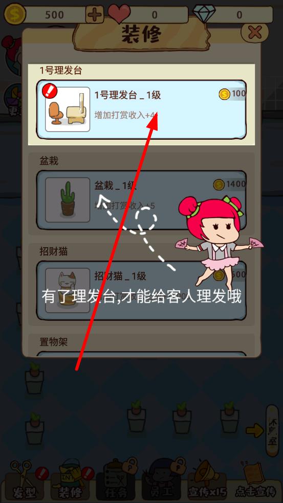 1、在“装修”界面优先解锁“1号理发台”,花费100金币,才能够开始做生意,有了理发台才能为顾客理发,开启经营第一步。