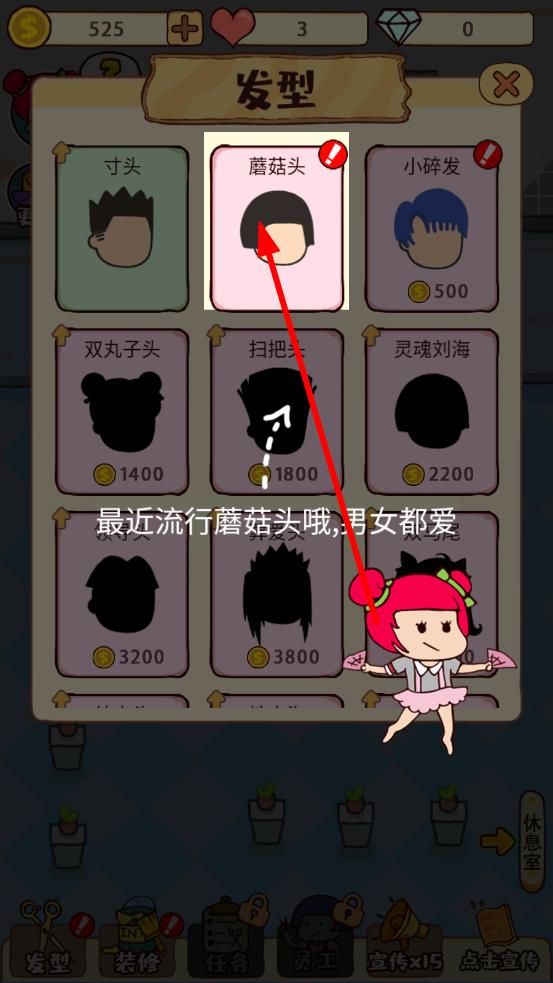2、切换到“发型”界面,用金币解锁热门发型,如“蘑菇头”需500金币,了解流行趋势,为满足顾客需求做准备,提升服务吸引力。