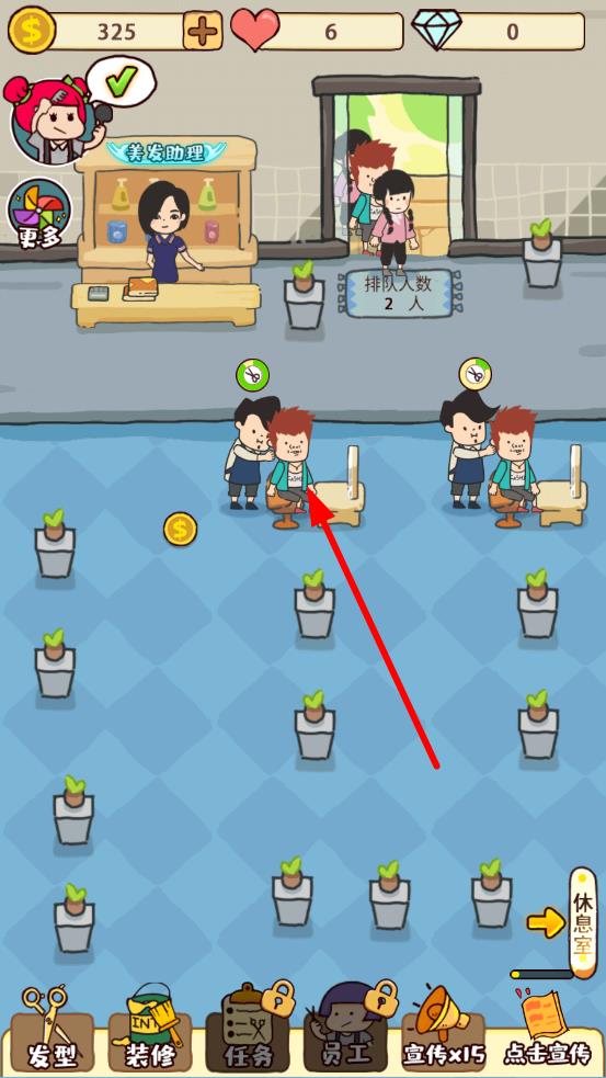 3、返回主界面,当有顾客排队,如显示“排队人数2人”,点击顾客安排至理发台,依据需求或流行发型为其修剪,完成服务获取金币。