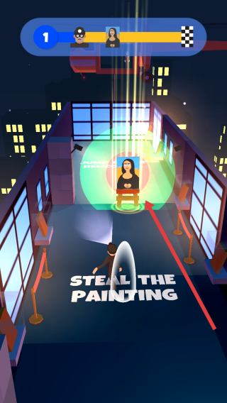 2、进入到关卡中,操控小偷角色,潜入展厅,避开守卫,靠近并窃取名画蒙娜丽莎,注意进度条。
