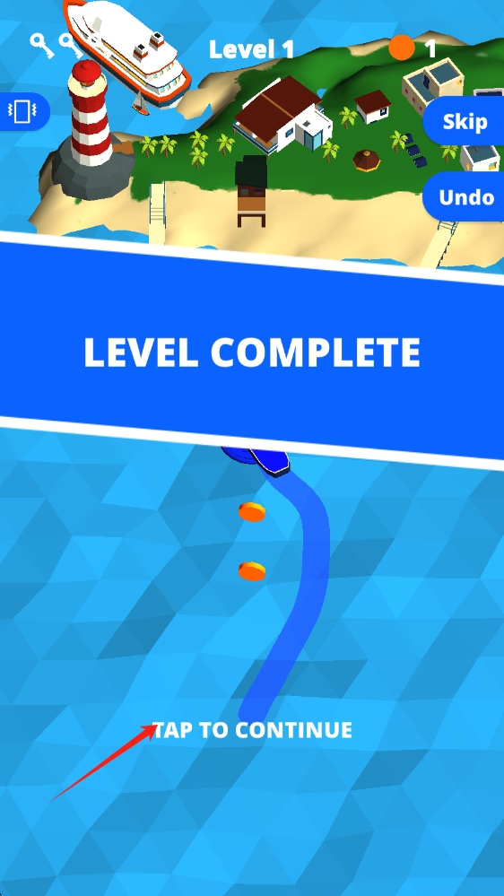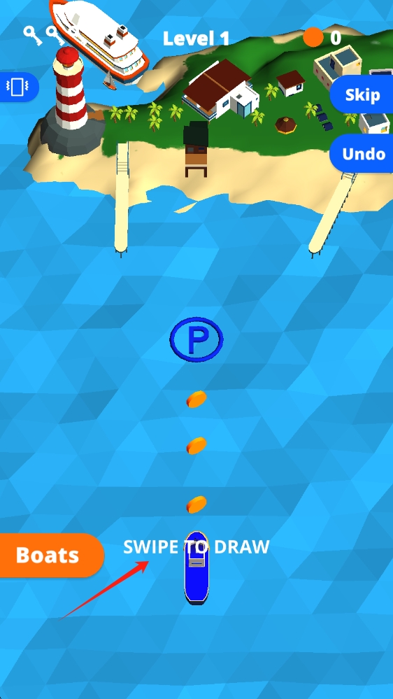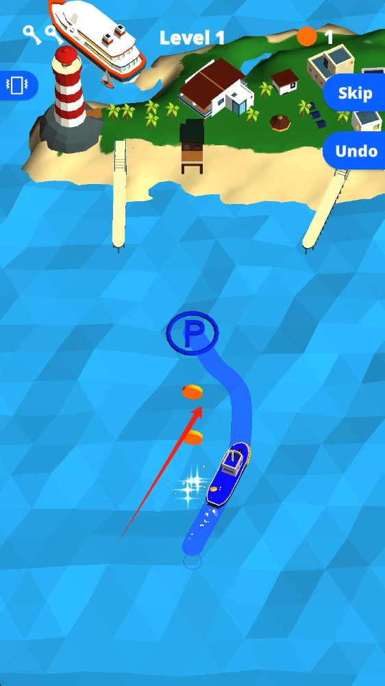 1、第1关,操控蓝色小船规划路径蓝色线条 ,收集金币,目标点 P,背景有岛屿、灯塔、房屋,滑动移动人物。