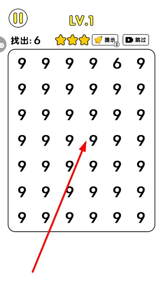 2、观察关卡内字符布局,聚焦差异点,如数字阵中唯一的6,点击识别,考验眼力与专注度,利用“提示”功能辅助,应对高难度关卡。