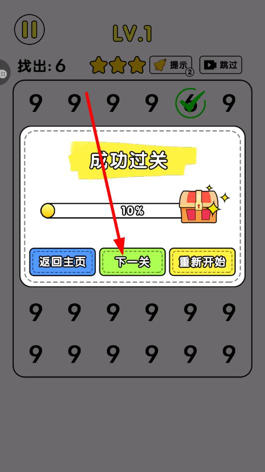 3、成功找出所有不同字符,本关为1个,触发“成功过关”界面,点击“下一关”,挑战更复杂文字或数字找茬,提升观察力,持续解锁新关卡。