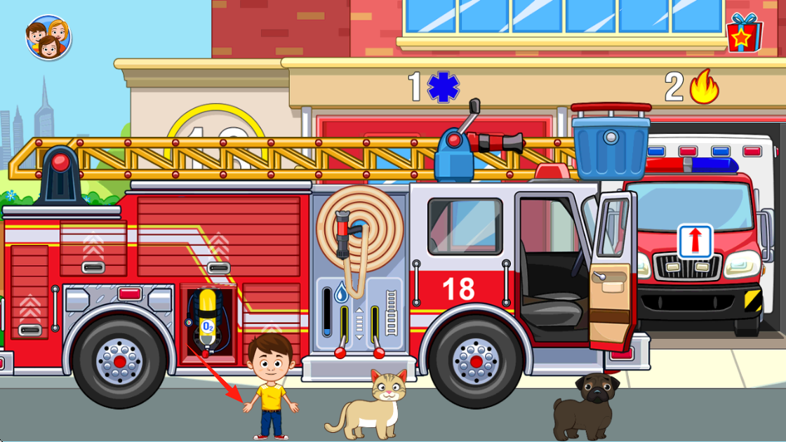3、点击男孩箭头指向,可与其互动,获取任务如协助整理消防装备,同时观察消防车旁的宠物,探索额外互动内容。